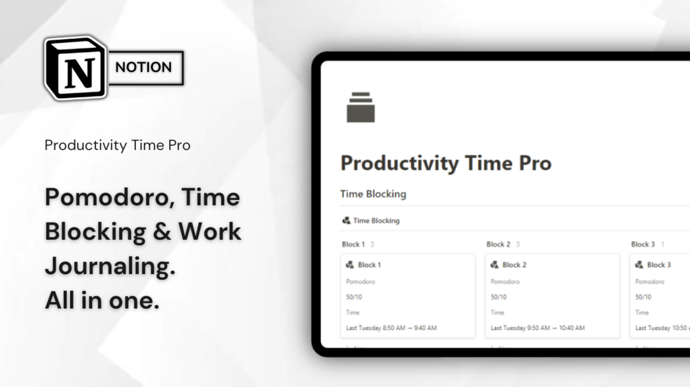 This template includes several productivity and organization techniques, Pomodoro, Time Blocking, and Work Journaling.